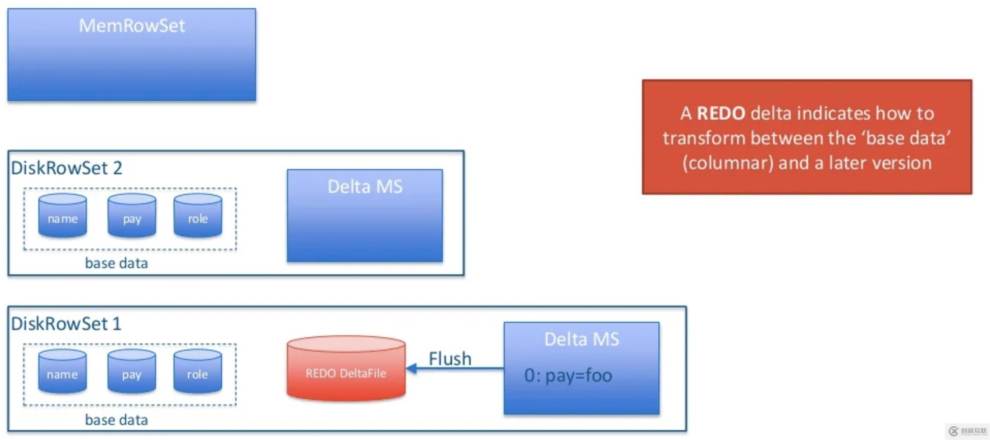 Delta StoreDelta Store 的方式比較有代表性的系統就是 Apache Kudu。在 Kudu 中,數據分為 Base Data 和 Delta Data,Base Data 中的主鍵都是唯一的,任何對于 Base 數據的修改會先寫入 Delta Store 中(通過行號標記與 Base Data 中的對應關系,這樣可以避免 Merge 時的排序)。與前面 SQL Server 的 Base + Delta 不同的是,Kudu 沒有標記刪除,所以同一個主鍵的數據會存在于兩個地方,所以查詢時必須將 Base 和 Delta 的數據合并才能得到最新的結果。Kudu 的方案如下圖所示: