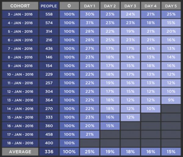 在上表中,558位用戶在1月3日安裝了應用,在其中有30%的用戶在一天之后回來訪問了這個應用,有23%的用戶在兩天以后訪問了這個應用,有24%是在3天以后,21%是在4天以后,而25%是在5天之后。