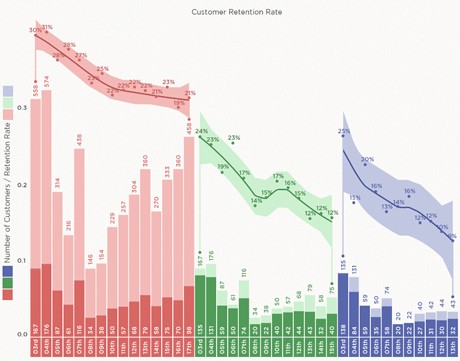 在圖標頂部的曲線顯示的是趨勢分析。粉色、綠色和藍色的平滑曲線分別代表著第1天、第3天和第5天的保留率隊列變化情況,圍繞著曲線的3種顏色的帶狀區域是保留率的可信區間。