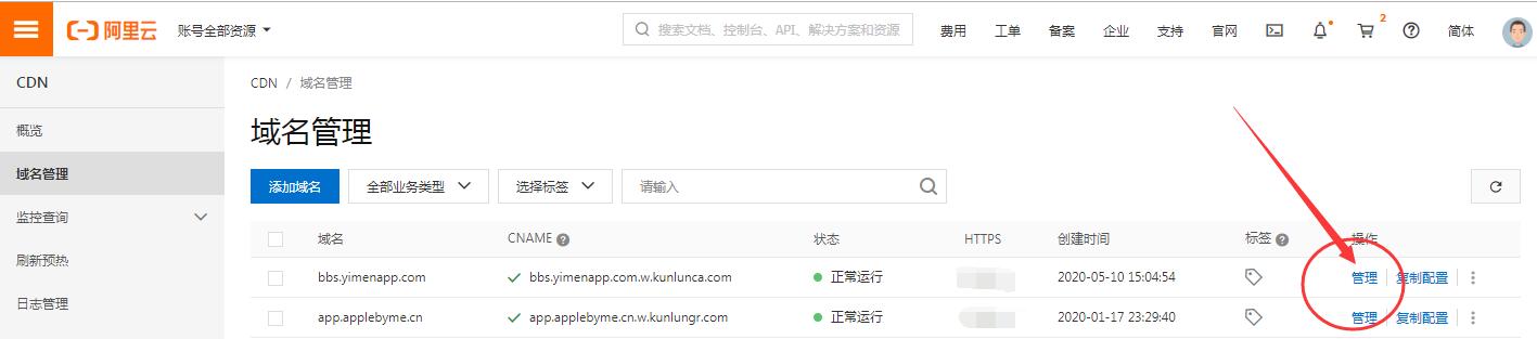 2.找到域名管理,點擊自己需要配置的域名【管理】