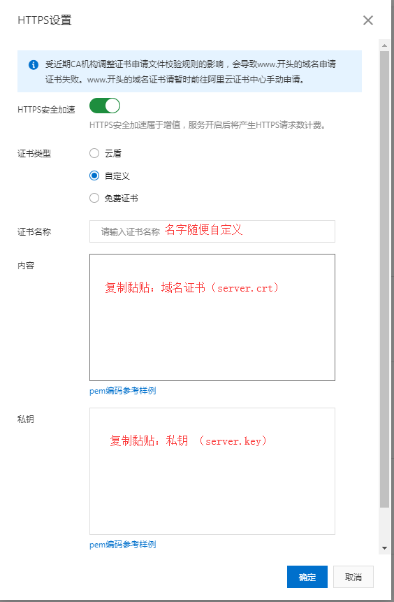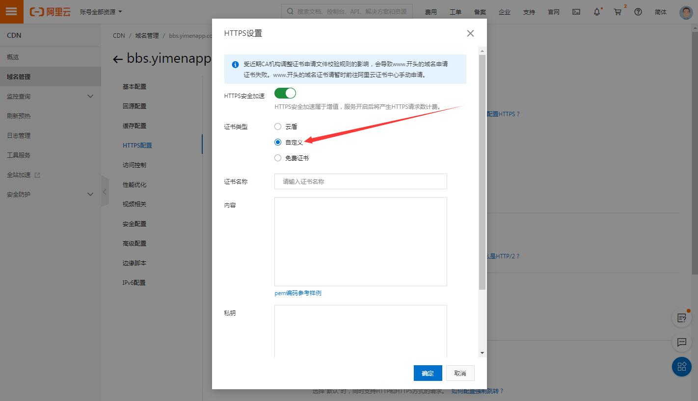 4.配置HTTPS證書,選擇自定義證書,復制服務器證書及密鑰進去保存即可