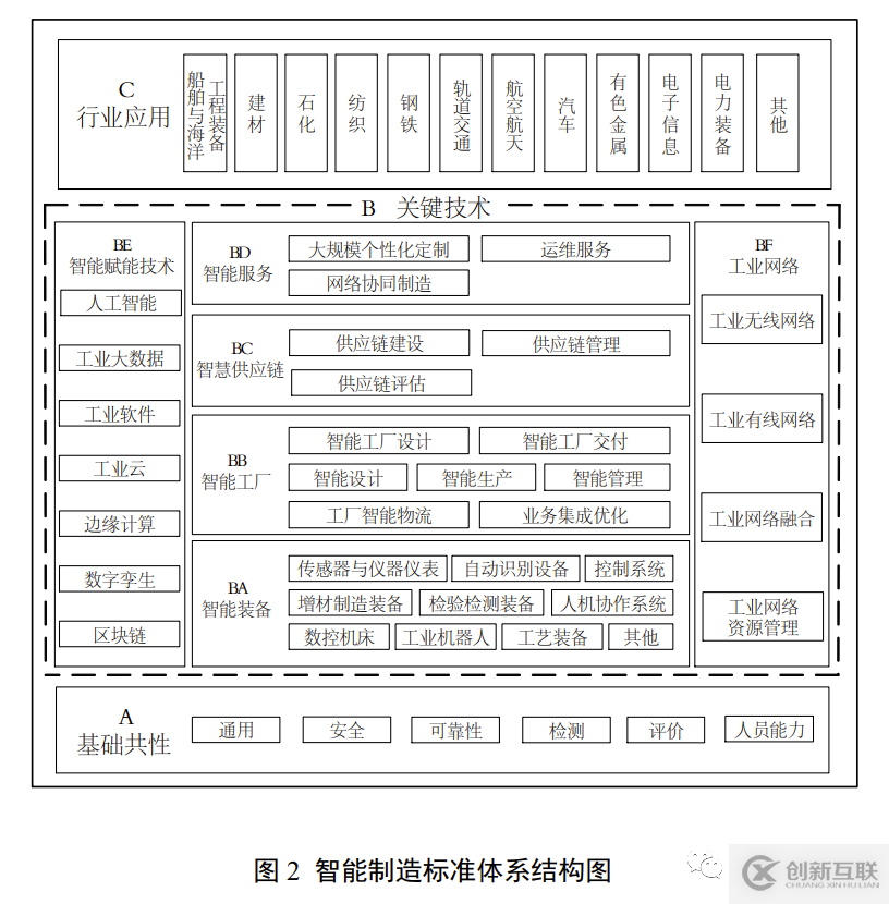智能制造標(biāo)準體系結(jié)構(gòu)包括“A基礎(chǔ)共性”、“B關(guān)鍵技術(shù)”、“C行業(yè)應(yīng)用”等3個部分,主要反映標(biāo)準體系各部分的組成關(guān)系。智能制造標(biāo)準體系結(jié)構(gòu)圖如圖2所示