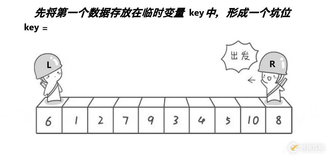 - 將begin處的值放到key中,將其置為坑位(pit),然后right開始行動找值補坑。