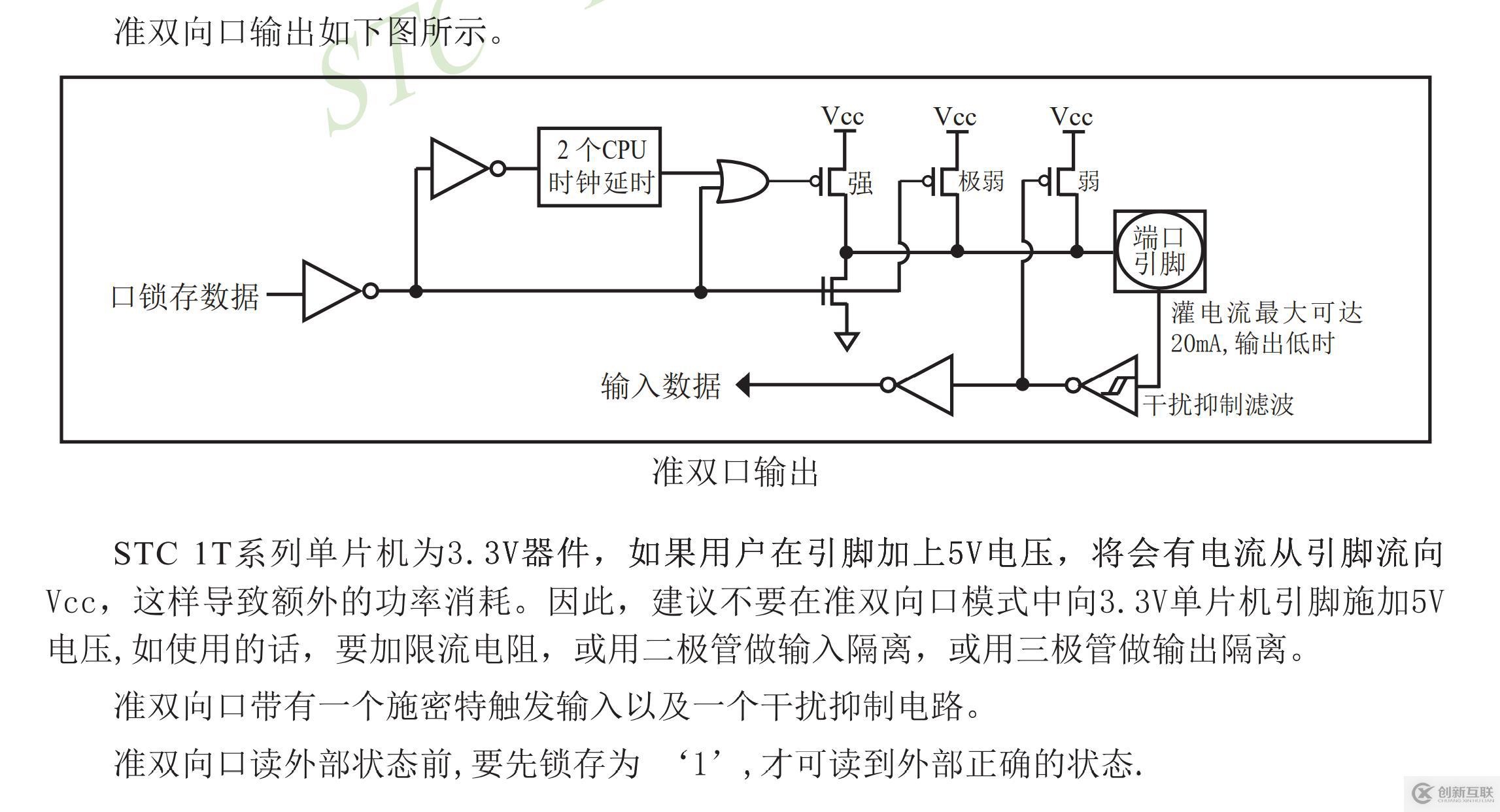 我們現(xiàn)在使用的STC15F2K60S2系列的P3口默認(rèn)都為準(zhǔn)雙向口,通過上面的圖片可以看到,如果端口引腳沒有輸入的時(shí)候,其輸入數(shù)據(jù)會(huì)被上拉電阻強(qiáng)行置為高電平。再看最后一句,準(zhǔn)雙向口讀取外部狀態(tài)前,要先鎖存為"1"才可讀到外部正確的狀態(tài),我們使用的15系列單片機(jī)在上電的時(shí)候就會(huì)把引腳置為高電平,已經(jīng)默認(rèn)鎖存為1,可以直接讀取外部狀態(tài)。