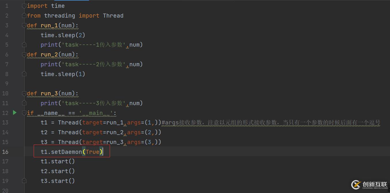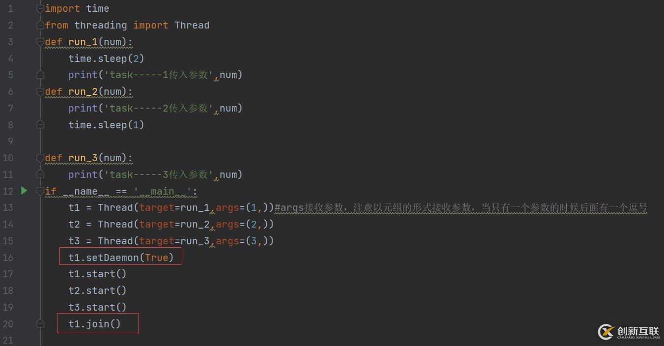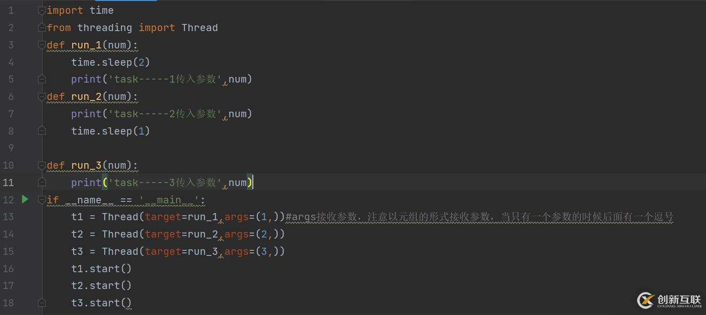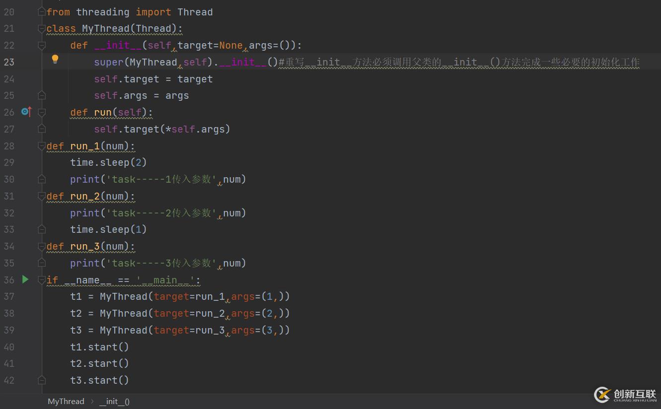 t.start()方法在執行的時候會自動調用run()方法,所以在自定義線程的時候只需要重寫__init__方法和run()方法即可,__init__方法負責接收參數,這些參數最后會傳入run()方法中,根據需要實現自定義功能。