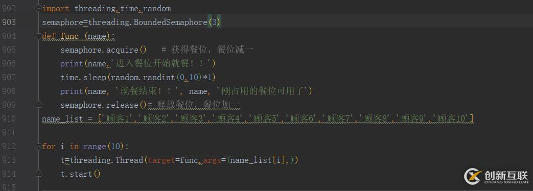 例如餐桌有三個位置,但是有10個人同時就餐,這時候就需要信號量參與保證餐桌上只有三個人,也就是線程的并發數始終是3。