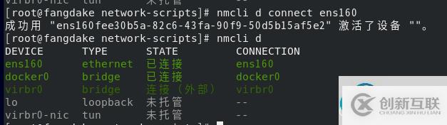 nmcli c up ens160請注意,一般地,CentOS8的默認網卡設備名稱都是ens160,而CentOS7一般是eth33。