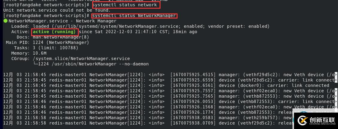我的操作系統是CentOS8,顯示的是?NetworkManager處于運行狀態,或許CentOS8默認就是NetworkManager。