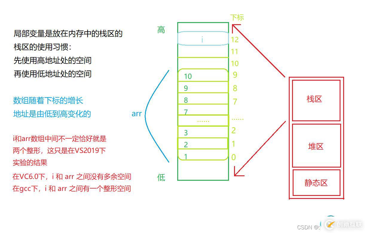 當 i 越界訪問到 arr [12] 時,本該和arr [10],arr [11] 一樣,將arr [12] 改為0,湊巧的是,i 的地址和arr [12] 的地址是同一空間,arr [12]里放的數組就恰好等于 i 的值,都是12,在arr [12] 被改為0時,i 的值也變為0,然后0<= 12,滿足循環條件,每當 i = 12后就會被改為0,這樣?i 永遠到達不了13,程序也就陷入了死循環。