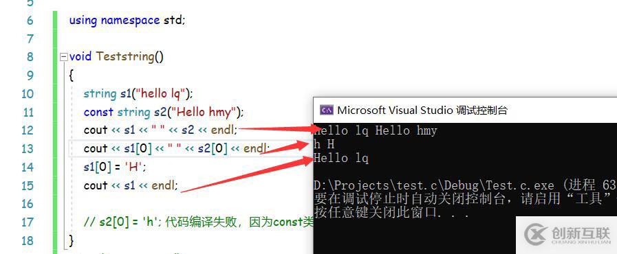 // s2[0] = 'h'; 代碼編譯失敗,因為const類型對象不能修改