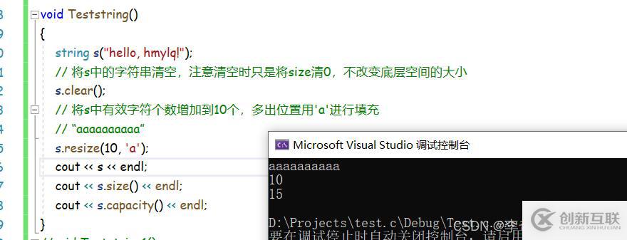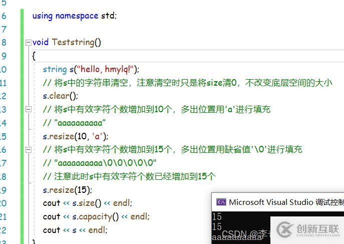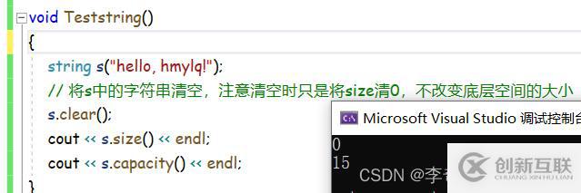 }此時clear是將字符串清空,大小變?yōu)?,但是容量不會改變.