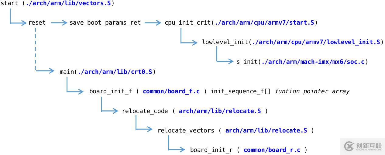總結一下,uboot啟動后,程序流的執行路徑: