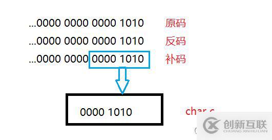 由于在計算機中數據是以二進制補碼的形式存放,所以我們將整數10轉化為二進制補碼,然后取前8位放入c中進行存放,對應圖解如下: