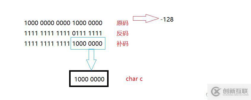 我們知道,當我們定義了一個變量c時,編譯器對c分配了8個bit位的內存空間,但是對于-128,它一開始并不是在變量c的內存空間中,是在寄存器中,需要先轉化為二進制后,才能放入c中,因此我們可以得到以下圖解: