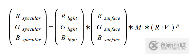 開始先是將光的顏色和物體表面的顏色相乘,這個和在計算環(huán)境光以及漫反射光時一樣。得到的結(jié)果再和材料的鏡面反射強(qiáng)度參數(shù)('M')相乘。如果材料沒有反射性能,比如木頭,那么鏡面反射參數(shù)就為0,整個公式的結(jié)果也就為0了,而像金屬這種發(fā)光材料鏡面反射能力就會很強(qiáng)。之后再乘以光線和觀察者視線夾角的余弦值,這也是最后一個調(diào)整鏡面反射光強(qiáng)度的參數(shù)('鏡面參數(shù)'或者叫做'發(fā)光參數(shù)')。