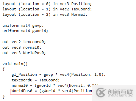 上面頂點著色器多了最后一行代碼,世界變換矩陣(之前用來變換法線的那個世界變換矩陣)這里用來將頂點的世界坐標(biāo)傳給片段著色器。