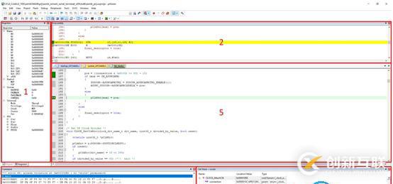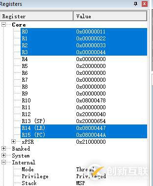 }進(jìn)入debug調(diào)試,可以觀(guān)察寄存器組,及堆棧中的值: