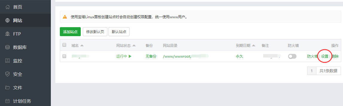 1. 登錄BT , 選擇【網(wǎng)站】,點(diǎn)擊要安裝站點(diǎn)后面的【設(shè)置】。