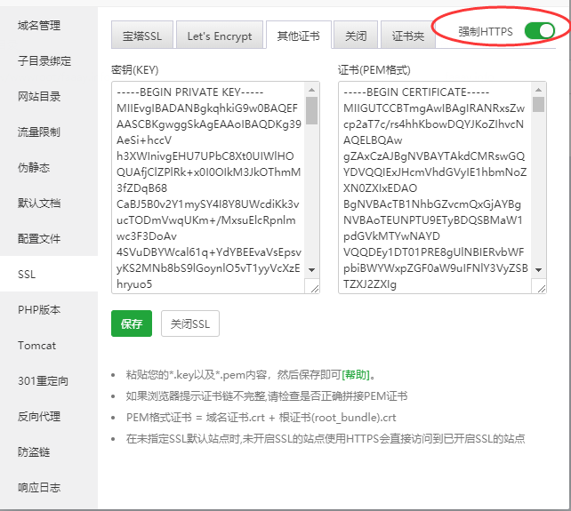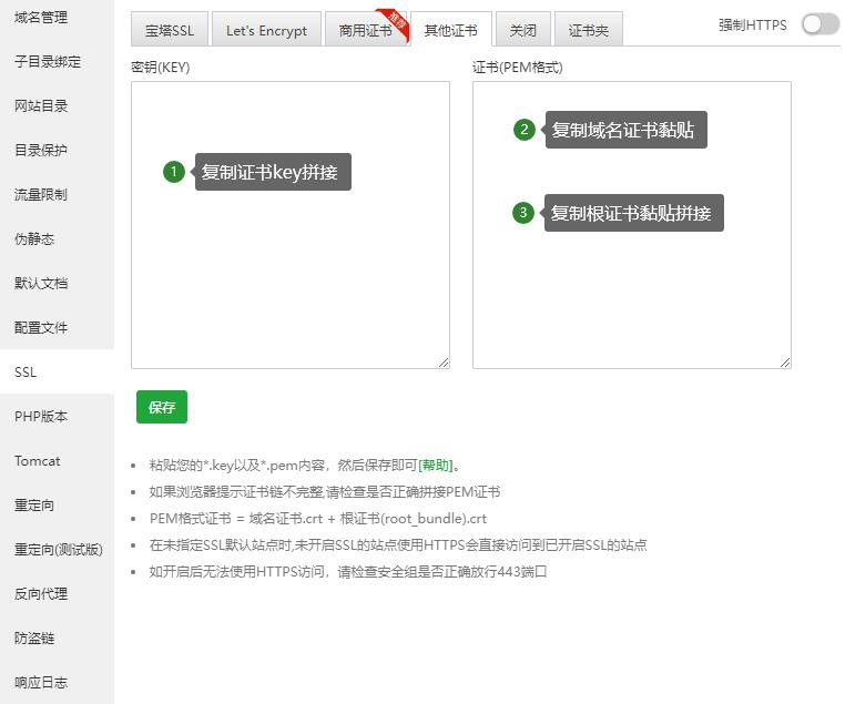 粘貼您的*.key以及*.pem內(nèi)容,然后保存即可[幫助]。