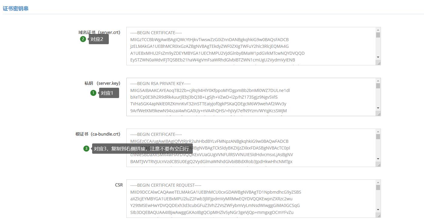 在您的pem配置項(xiàng)目里面直接復(fù)制域名證書(shū)(server.crt)+根證書(shū)(ca-bundle.crt)