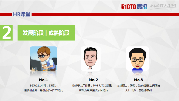 發展階段和成熟階段的企業邵老師做了一個基本的模型,第一個候選人他是一個985、211本科的情況,85后,創業者,有創業經歷的CTO,這種人選特別適合初創型公司去招的CTO的崗位。像BAT大廠的背景,在一個總監或者高工的情況他可能有過千萬用戶量級的用戶經歷,他適合C輪左右的,或者B輪左右的企業會比較適合。還有像名教碩士,而且有海歸背景的,像微軟傳統大廠出身,非常適合上市平臺,或者是D輪企業CTO的人選。