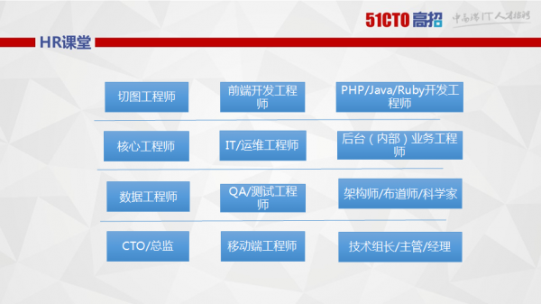 這個世界上有兩種人,程序員和非程序員;這個世界上有兩種招聘,技術招聘和非技術招聘。6月24日由51CTO高招主辦的“高招HR課堂——揭秘技術人才招聘”的分享活動上,51CTO人才業務部總監邵燕、優才學院CEO伍星及云適配HRD郭妮,從了解技術、篩選簡歷、面試技巧、組建團隊等多個方面闡述技術型人才招聘方法和如何與技術人交流溝通。
