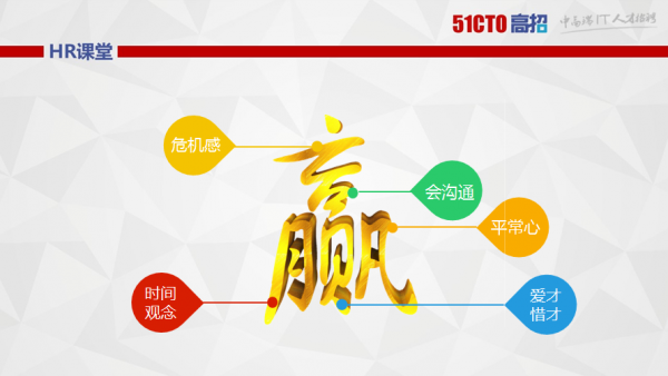 最后郭老師用 “贏”字來總結一下HR的工作,“贏”字的亡代表HR要有危機感; HR做的是中間是口,要會溝通,要是見人說人話,見鬼說鬼話,見到程序員說程序員的話;月,HR要有時間觀念;中間的貝字,對于HR來講大的寶貝是人才;最后一個字是凡,我們要有一顆平常心。