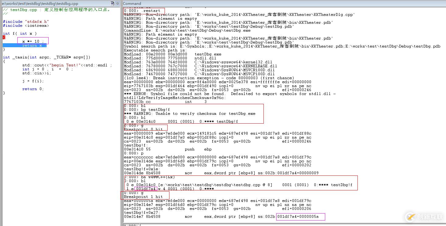 輸入 ba w4 @@C++(&x)命令。“&i”表示變量 i 的地址,“w”表示寫入操作,“4”表示只處理&x地址處 4 字節的寫入操作。F5 運行,程序被成功中斷下來 Breakpoint 1 hit。