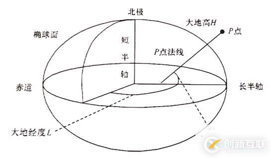 空間大地坐標系是采用大地經(jīng)緯度和大地高來描述空間位置的(下圖)。維度是指P點的法線與赤道面的夾角,用B(-90°~ 90°)表示,向北為正稱為北緯,向男為負稱為南緯。經(jīng)度是指P點的參考橢球子午面與起始子午面的二面角,用L表示(-180°~180°),由起始子午面起算,向東為正稱為東京,向西為負稱為西經(jīng)。大地高是空間點沿該法線到橢球面的距離,用H表示,向上為正,向下為負。