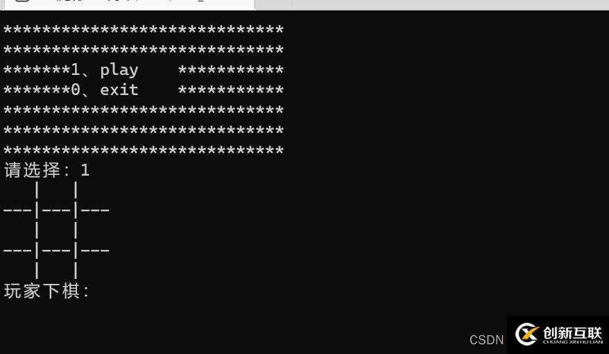 2、玩家選擇游戲界面玩家輸入0/1進入游戲? 調(diào)用菜單界面? 選擇1調(diào)用game函數(shù)開始游戲? ?選擇0退出游戲