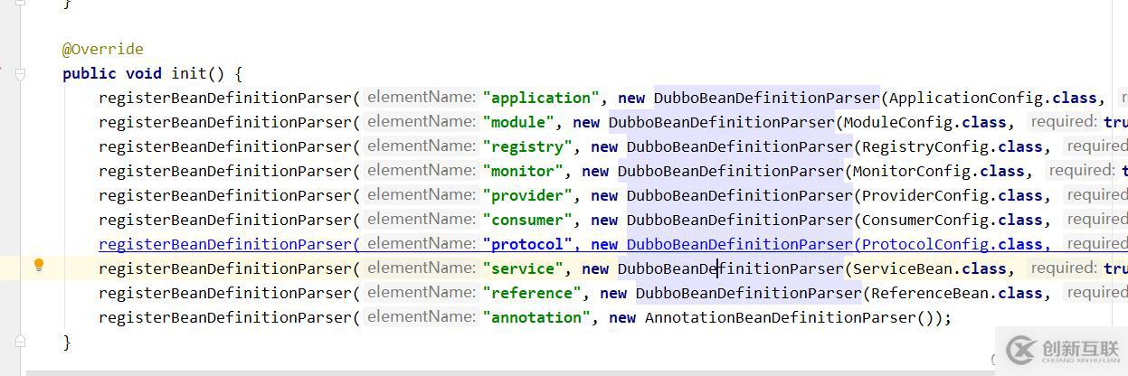 在結合xml使用的時候,dubbo有引入DubboNamespaceHandler,該handler會解析相關的xml標簽,完成如上功能: