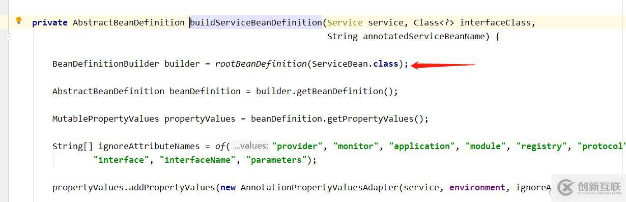 該類是一個前置處理器,會掃描@service標記的類,通過構建BeanDefinitionBuilder完成ServiceBean的注冊: