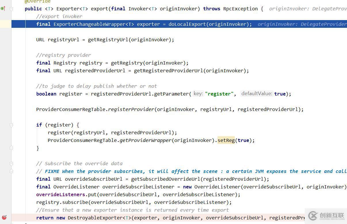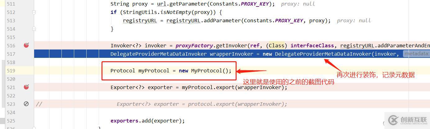 以上截圖就是dubbo在做服務發布的核心代碼了,這里dubbo使用了動態代理(SPI)+裝飾器模式,完整的構造了一個Invoker和Exporter