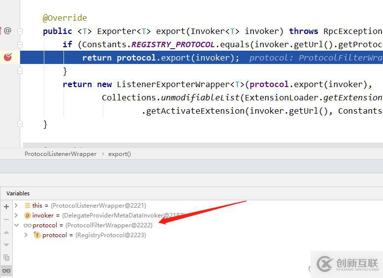而ProtocolListenerWrapper里面包裝的protocol是:ProtocolFilterWrapper,而ProtocolFilterWrapper里面包裝的protocol是RegistryProtocol(真正干活的)