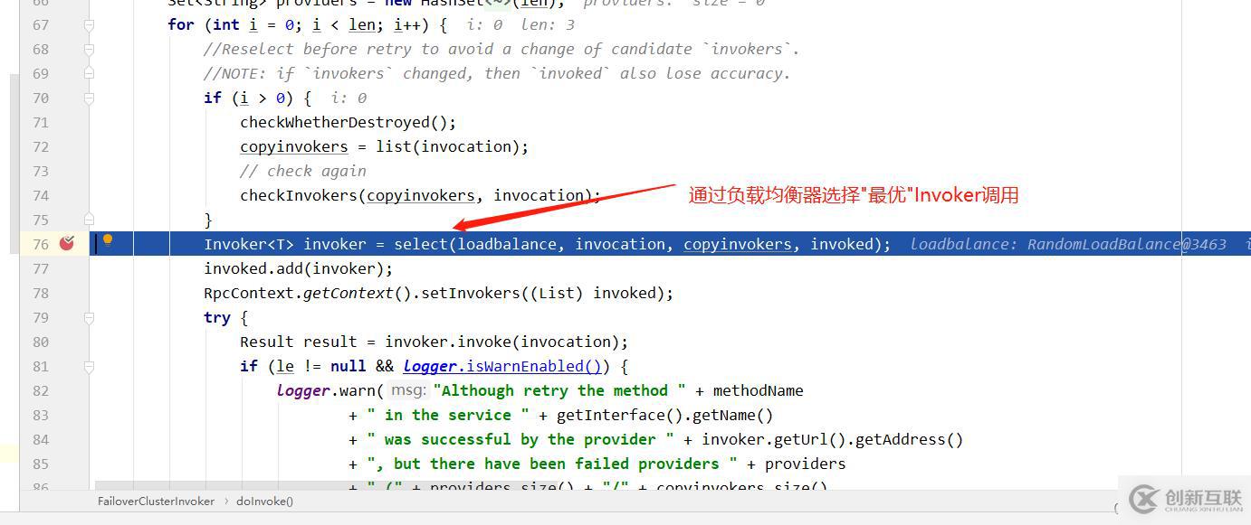 從以上代碼注釋中可以看出,FailoverClusterInvoker,通過負載均衡器選擇"最優"的Invoker發起遠程調用