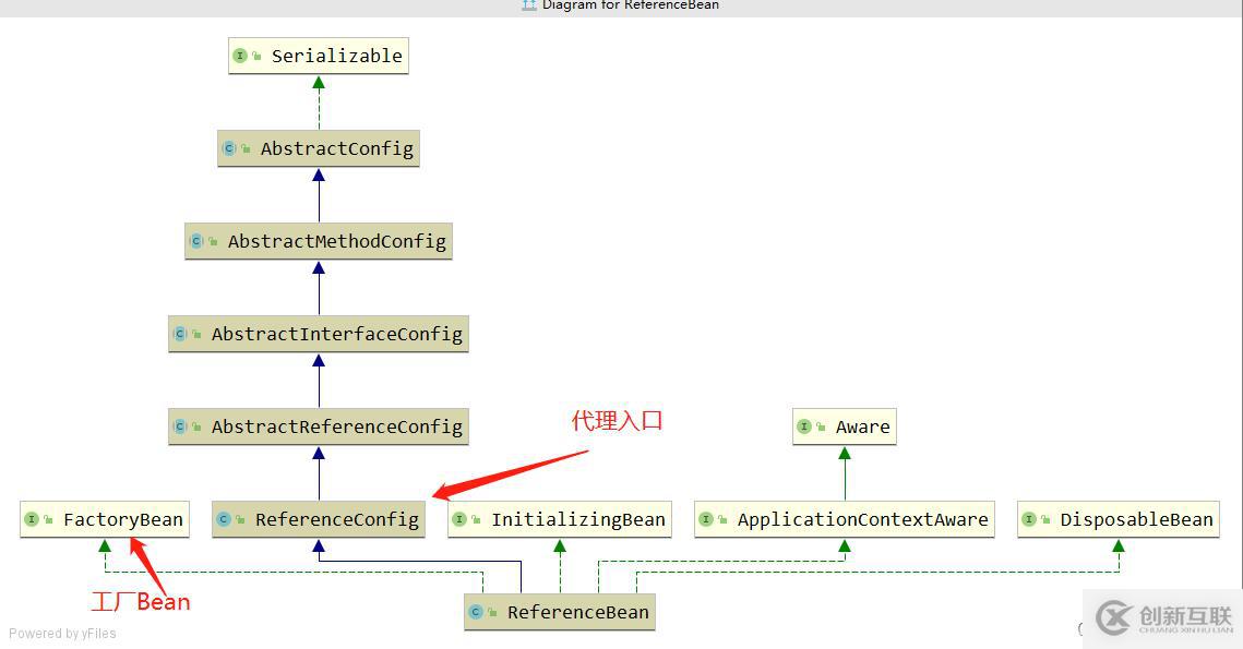 其中FactoryBean就是spring的工廠Bean,和ServiceBean類似,ReferenceBean也繼承一個Config類,如上,服務調用的故事就從ReferenceConfig的#get()開始