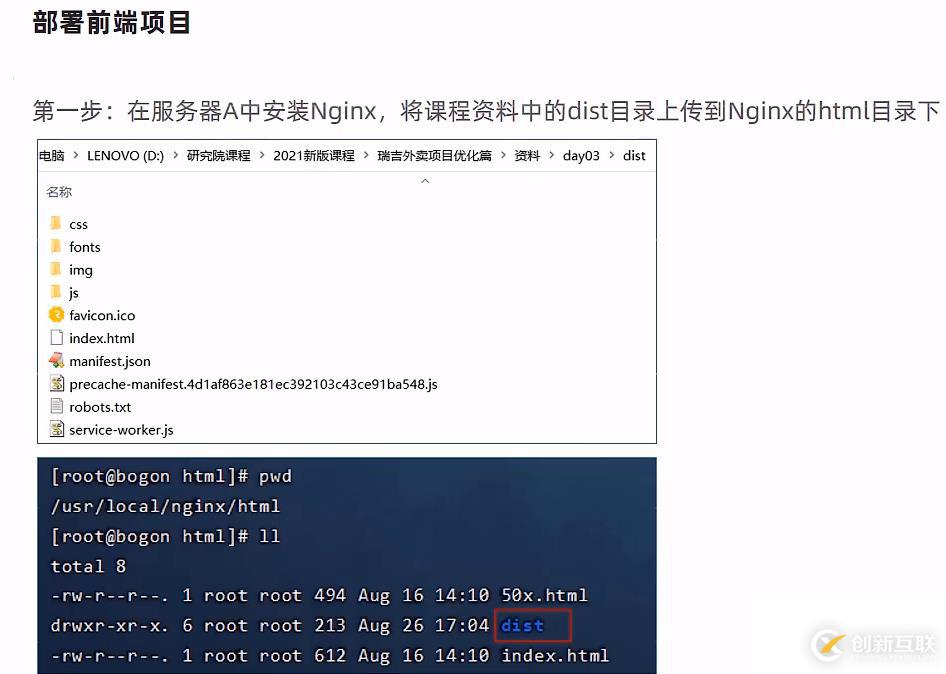 第一步:在服務器A中安裝Nginx,將課程資料中的dist目錄上傳到Nginx的html目錄下