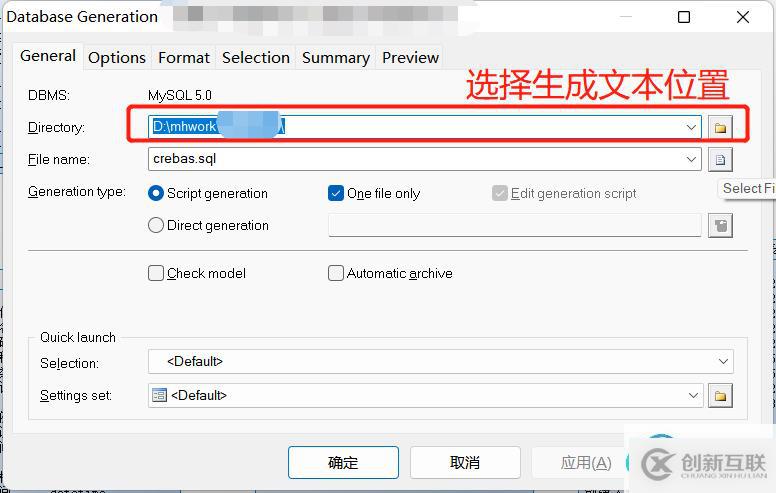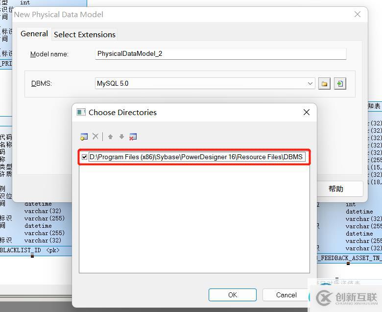 2、 DBMS選擇“MySQL5.0”,如果沒有選擇框擇選擇安裝目錄下"Sybasel\PowerDesigner 16\ Resource Files\DBMS"這個文件夾就有選擇框了。