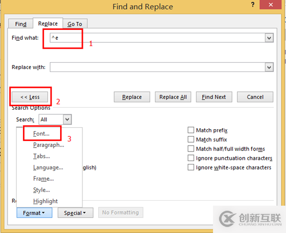 在替換對話框中,查找"^e"(不包含雙引號,一般鍵盤中,在英文輸入狀態下同時按下Shift和主鍵盤中的數字6即可輸入^),之后選擇"高級",在格式下拉菜單中找到"字體"。