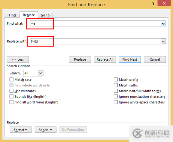 注:若是先添加了方括號"[]"后在進行替換,在"^e"兩側加上方括號,即"[^e]"并不要勾選"使用通配符",再點擊替換全部即可。