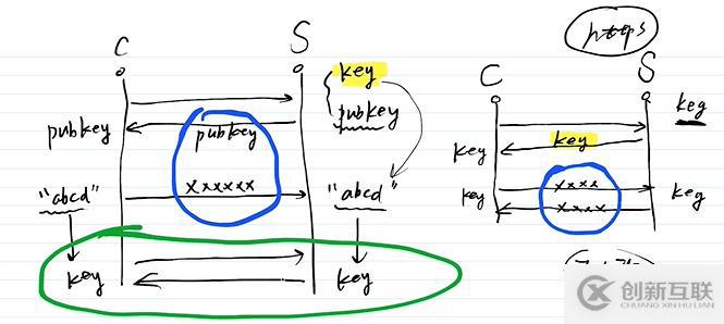 非對稱加密:A加密,B解密。key在服務端用來解密;解密后隨機碼在服務端;key對稱加密。但是中間人攻擊可能會置換publicKey,所以使用瀏覽器來校驗第三方證書。