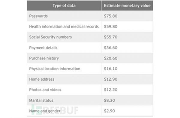 PII在地下市場確實有實際的貨幣價值,其中這些被盜信息的價格取決于它們對欺詐者的可用性,可用性越大,價值越高,反之亦然。通過對地下市場網絡犯罪數據的分析和研究,我們得出的被盜數據價值如下所示: