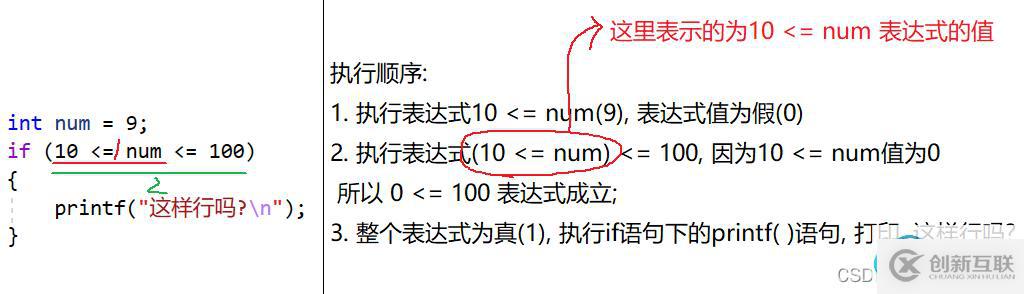 1. C語(yǔ)言中關(guān)系操作符連續(xù)使用和數(shù)學(xué)中要表達(dá)的意思不一樣, 例如數(shù)學(xué)中想要表達(dá)10到100, 可以寫(xiě)成10<= 100, 但是C語(yǔ)言中可不能這樣寫(xiě), 雖然語(yǔ)法支持, 但是表達(dá)的意思會(huì)有出入.