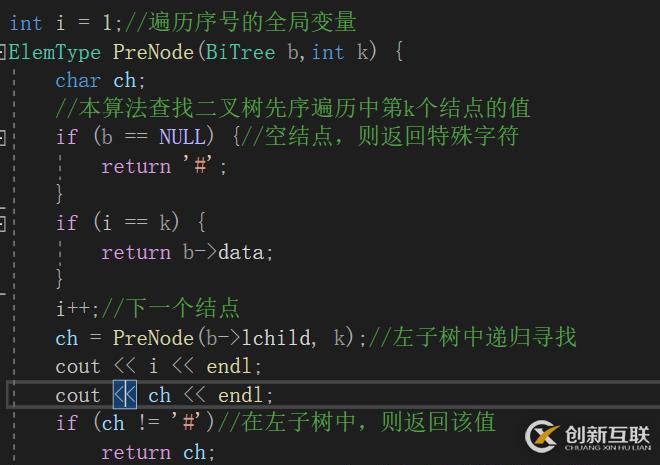 ch = PreNode(b->lchild, k);//左子樹中遞歸尋找