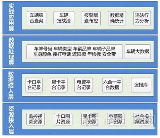 數據接入層:實現平臺間的數據對接和分類匯聚整理,卡口平臺和電警平臺的非結構化和半結構化過車數據用于深度識別分析,六合一平臺、車駕管庫、盜搶庫等結構化數據可接入車輛大數據。
