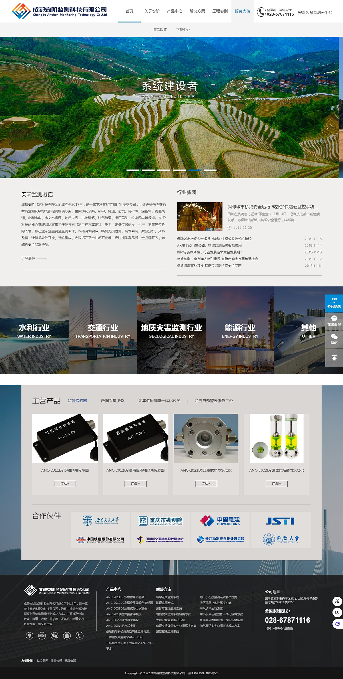 成都安階監測科技有限公司成立于2017年,立足安全監測領域,涉足公路、鐵路、路橋隧、軌道交通、水利、水電、水文水資源、 地質災害、市政建筑、古建筑、危險建筑、深基坑、油氣儲運、港口碼頭、核電、風電.輸配電、尾礦庫和礦山等多個行業。