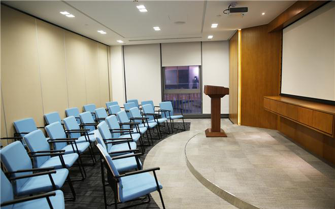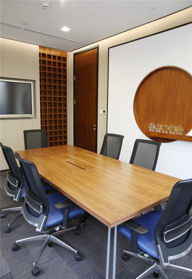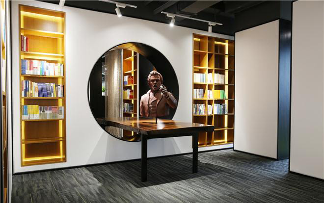 在空間布局上著重考慮書院空間的打造,整個書院以“月亮門“的使用為主線貫穿始終,并營造出前后錯疊的空間進深感,讓參觀者有序自由的參觀整個書院,書院與對外接待的會客室聯通一體,并且會客室的房名以不同的法律名詞命名(例如:民-定分),即明確出每個房間的不同功能,又不失文化特色;自始至終都讓來訪者游走在法律知識的空間內。