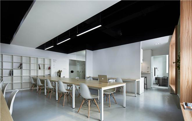 在有限的面積中為員工營造了輕松的閱讀與交流空間.豐富的玻璃隔斷形成通透的空間,相互貫穿,模糊了空間屬性,從而削弱小空間帶來的局促感。