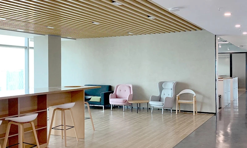 設計師以細膩又不失理性的原木色為基調,刪除繁瑣復雜的設計和過多的裝飾,減少辦公中的壓抑與束縛,創造出簡潔而又充滿張力的辦公空間。并且在功能區域附近設置了更多的公共空間,將最好的景觀和設施留給員工,為員工營造舒適美好的辦公化境,無形之中提升員工效率。