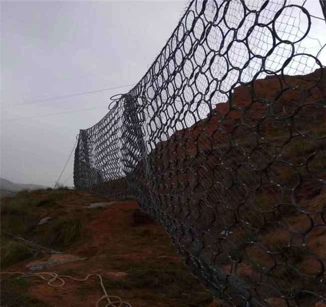 被動(dòng)防護(hù)是由鋼絲繩網(wǎng)、環(huán)形網(wǎng)、(需攔截小塊落石時(shí)附加一層鐵絲格柵)、固定系統(tǒng)(錨桿、拉錨繩、基座和支撐繩)減壓環(huán)和鋼柱四個(gè)主要部分構(gòu)成。鋼柱和鋼絲繩網(wǎng)連接組合構(gòu)成一個(gè)整體,對(duì)所防護(hù)的區(qū)域形成面防護(hù),從而阻止崩塌巖石土體的下墜,起到邊坡防護(hù)作用。